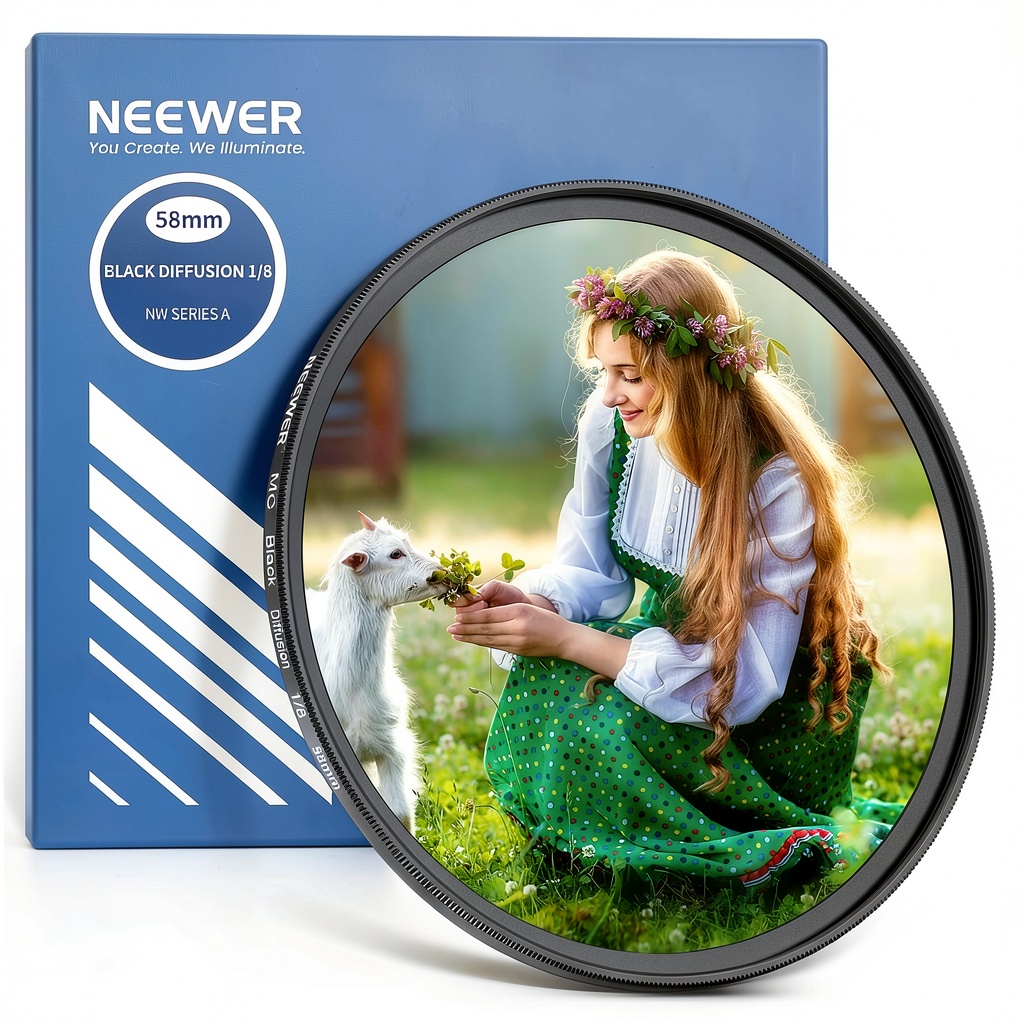 The Neewer 58mm Black Diffusion 1/8 Filter is designed for photographers and videographers seeking to add a soft, dreamy cinematic quality to their work. Crafted from high-quality optical glass with multiple nano coatings on both sides, this filter reduces highlights and glare, resulting in smoother skin tones and enhanced visual appeal. Its ultra-slim aluminum frame minimizes vignetting on wide-angle and telephoto lenses, while CNC trapezoidal patterns ensure easy installation and removal. Compatible with all 58mm camera lenses, it is an essential accessory for achieving professional-grade effects in various shooting conditions.