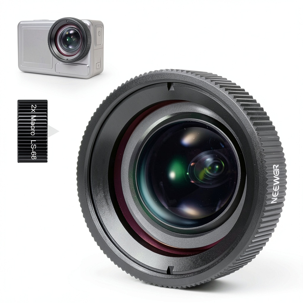 The Neewer 2X Macro Lens is a precision accessory compatible with DJI Osmo Nano, Action 5 Pro, and Action 4 cameras, engineered to elevate close-up photography. It features a 2x magnification capability, allowing you to capture intricate details from a focal distance of 3-4cm, which is significantly shorter than standard lenses. Constructed with multicoated HD optical glass comprising 2 elements in 1 group, it delivers exceptional clarity and sharpness. The lens is housed in a robust CNC-machined aluminum alloy frame with a black anodized finish, ensuring durability and portability for various shooting environments. Note that it is not designed for underwater use, as it lacks weather sealing, and water exposure can impair image quality. Installation is straightforward—simply remove the original lens and screw this one on for immediate use.