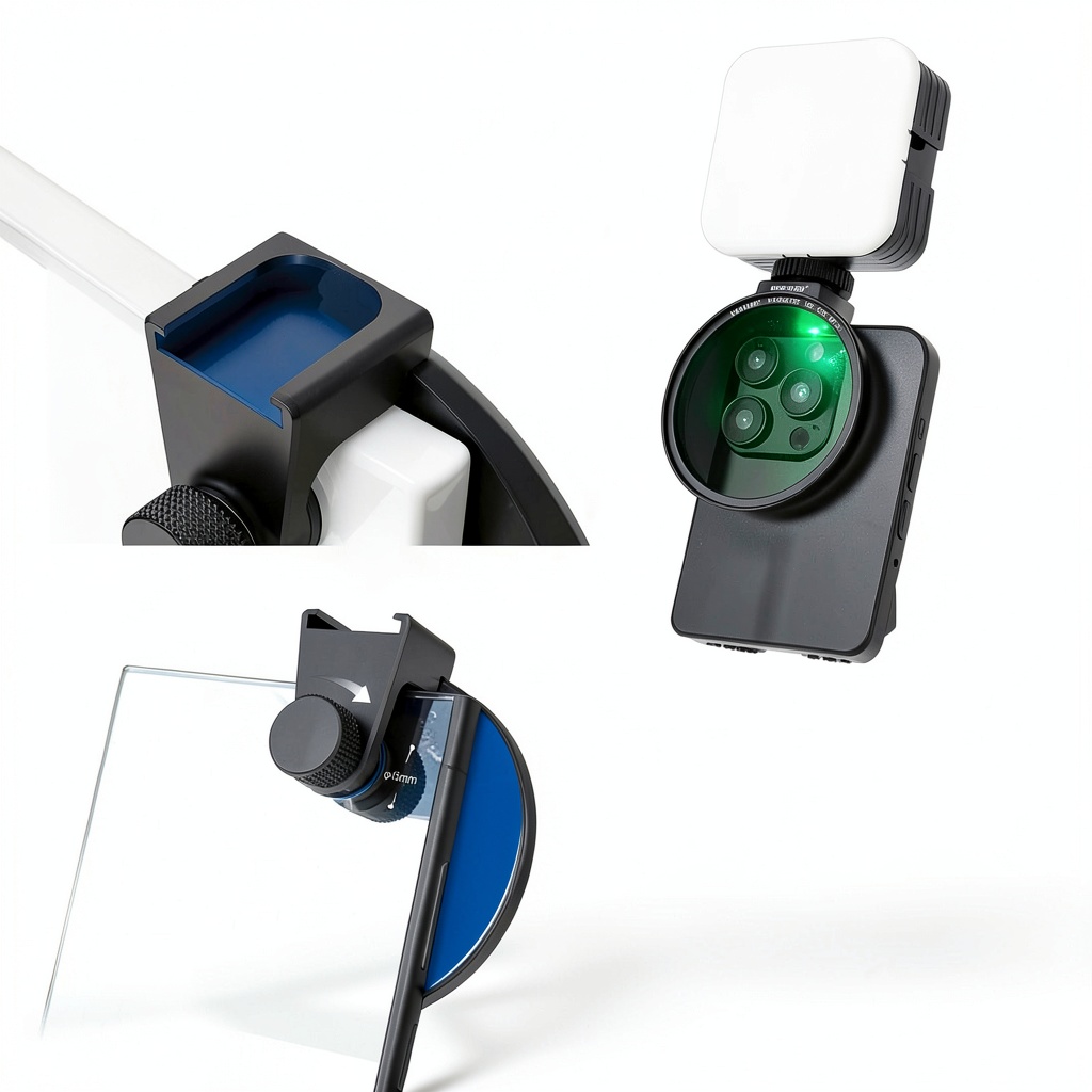 Simply clip the phone holder onto your smartphone, ensuring it’s centered over the main camera lens. Then, snap the magnetic CPL filter onto the clip—it will lock in place automatically for stable use during shooting.