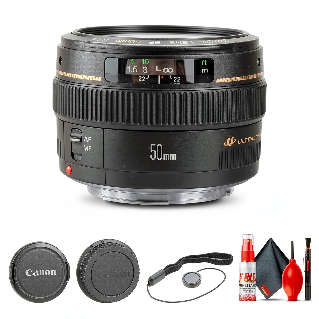 The bundle includes the Canon EF 50mm f/1.4 USM Lens, a 58mm 3-piece filter kit, a lens pouch, a lens cap keeper, and a cleaning kit.