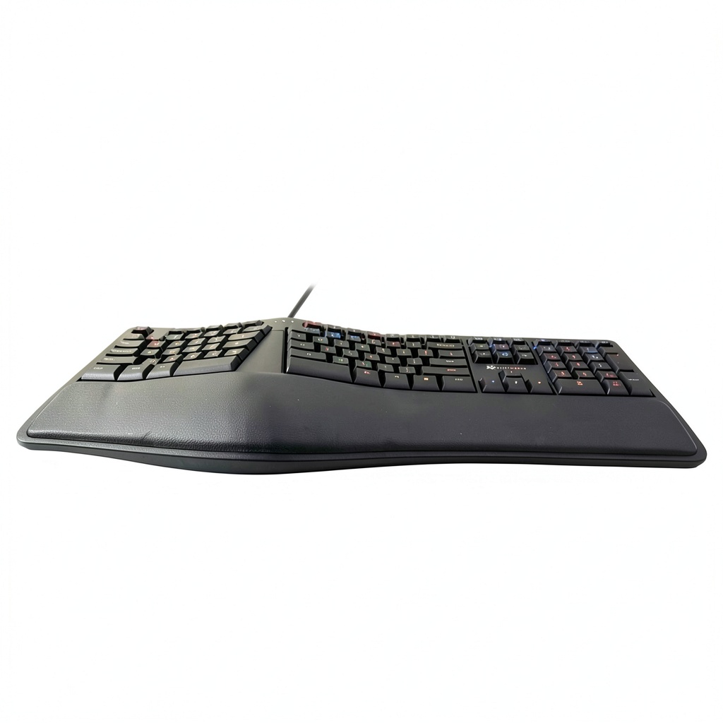 The X9 wired ergonomic keyboard combines advanced ergonomics with practical functionality to support comfortable and efficient typing. Crafted with a split design that aligns with the natural position of your hands, it reduces muscle strain and fatigue. The built-in cushioned wrist rest provides additional support, making it ideal for prolonged use. Constructed from high-quality materials, this keyboard features a durable black finish and reliable USB connectivity for seamless plug-and-play operation. Specifications include standard key layout, responsive keys, and a sturdy build that withstands daily wear.