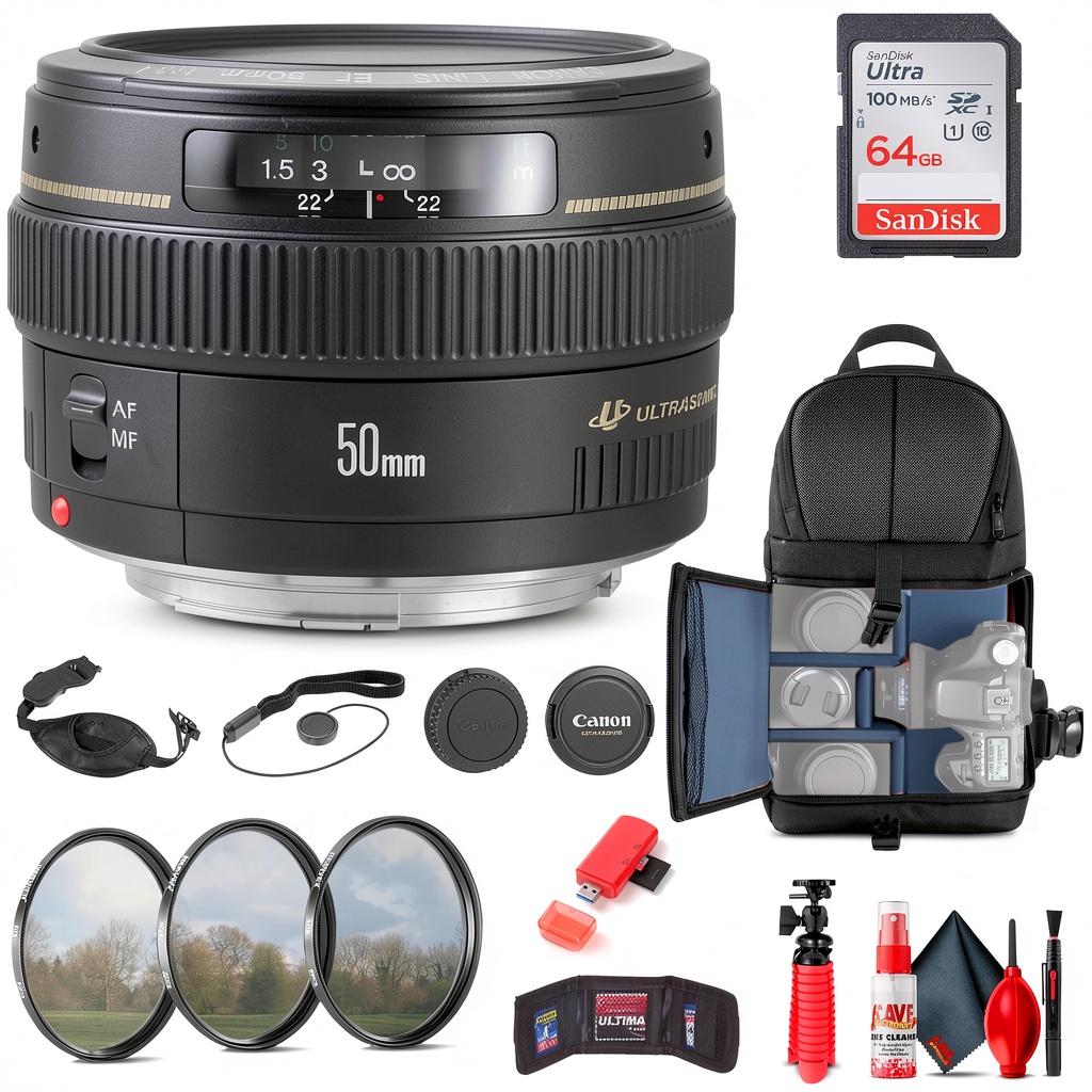 This bundle stands out with its comprehensive accessory set, offering immediate value without additional purchases. The Canon EF 50mm f/1.4 USM Lens itself is renowned for its optical quality and reliable USM autofocus, backed by a 1-year seller warranty for peace of mind. Compared to standalone lenses, this kit includes professional-grade filters to enhance image quality, a durable backpack for transport, and ample storage with a 64GB card, saving time and money. The international version ensures broad compatibility, while the thoughtful inclusions like the cleaning kit and tripod support long-term use and versatility in various shooting conditions.