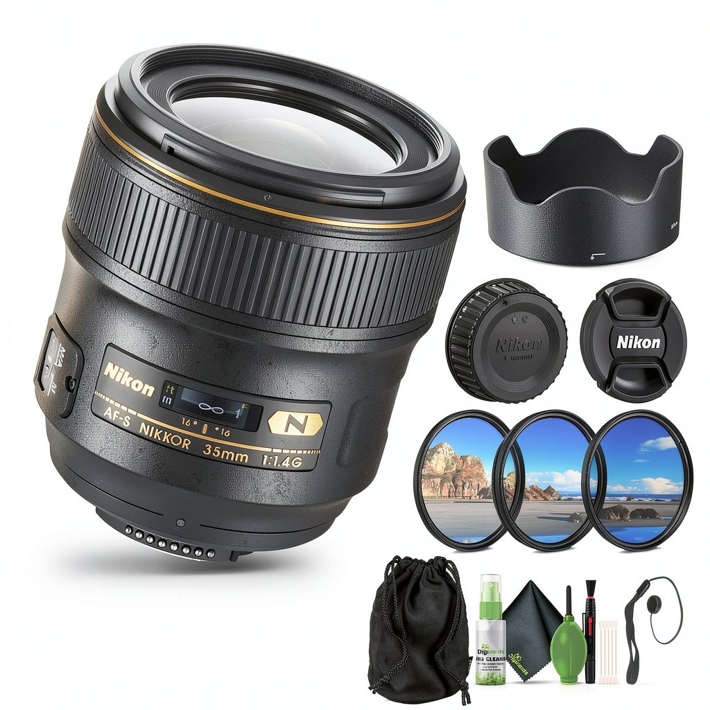 The Nikon AF-S NIKKOR 35mm f/1.4G wide-angle lens is a high-performance prime lens designed for Nikon DSLR cameras, offering a versatile focal length ideal for everyday photography. With a fast f/1.4 maximum aperture, it excels in low-light conditions and allows for greater control over depth of field, making it suitable for isolating subjects and achieving creative bokeh effects. The lens features a precision optical design that includes a single aspherical element to minimize spherical aberrations and distortion, resulting in sharp, accurate image rendering. Additionally, the Nano Crystal Coat reduces flare and ghosting, enhancing contrast and color fidelity in challenging lighting situations. This bundle includes the lens, a 3-piece filter kit, a lens cap keeper, and a cleaning kit, providing a comprehensive setup for photographers. The international version comes with a 1-year seller warranty, ensuring peace of mind for your investment.