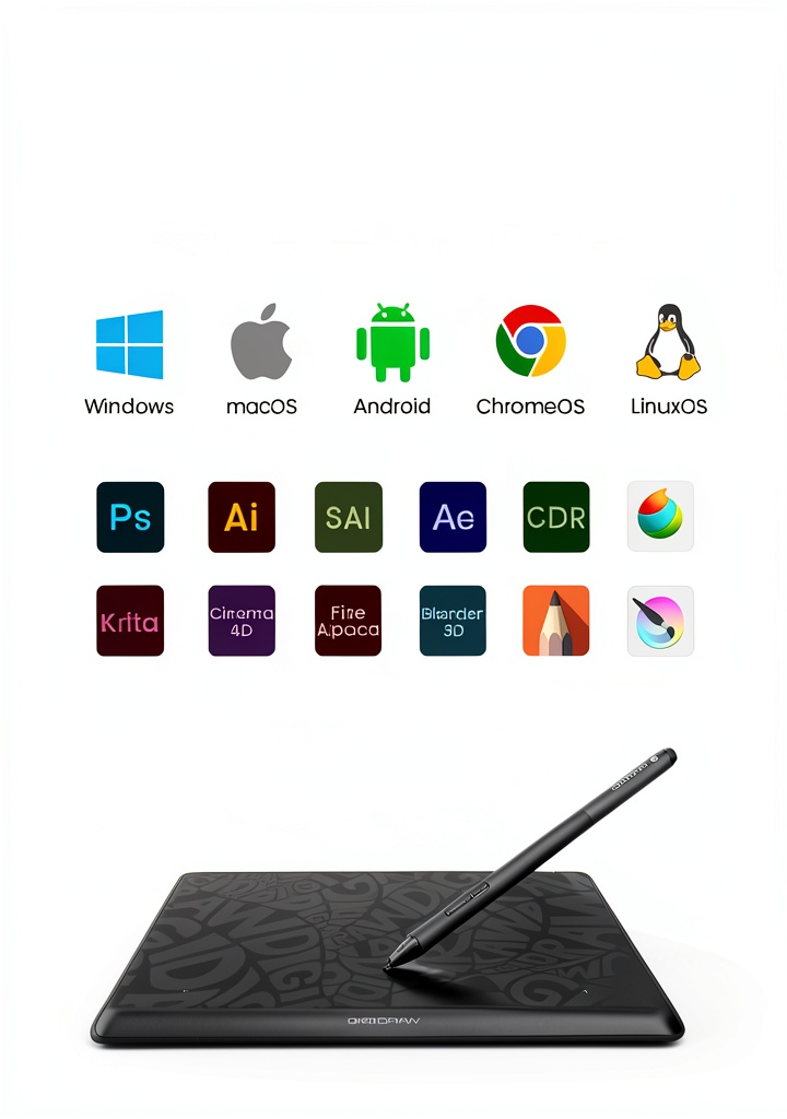 The tablet supports popular creative software including Adobe Photoshop, Illustrator, Clip Studio Paint, Corel Painter, and many others on Windows, macOS, ChromeOS, and Android.