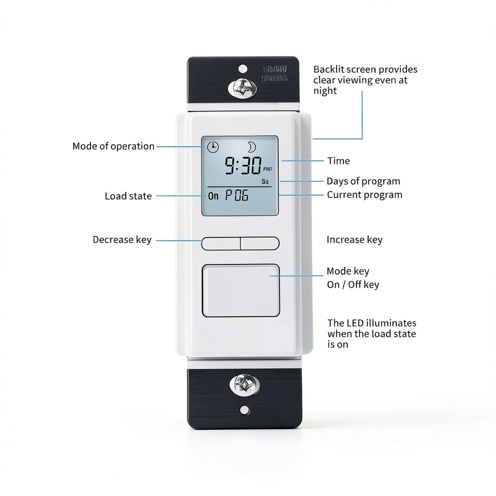 This timer switch is ideal for homes, offices, and commercial spaces where automated lighting control is needed to enhance convenience and energy efficiency. It is commonly used in living rooms, bedrooms, hallways, and outdoor areas to manage lights, fans, and motor-driven devices based on time or solar events. The target audience includes homeowners, facility managers, and DIY enthusiasts seeking a user-friendly solution for reducing energy consumption and improving security through scheduled lighting. Realistic usage scenarios include setting lights to turn on at sunset for safety, programming daily routines for consistency, and integrating with existing electrical systems without complex installations.