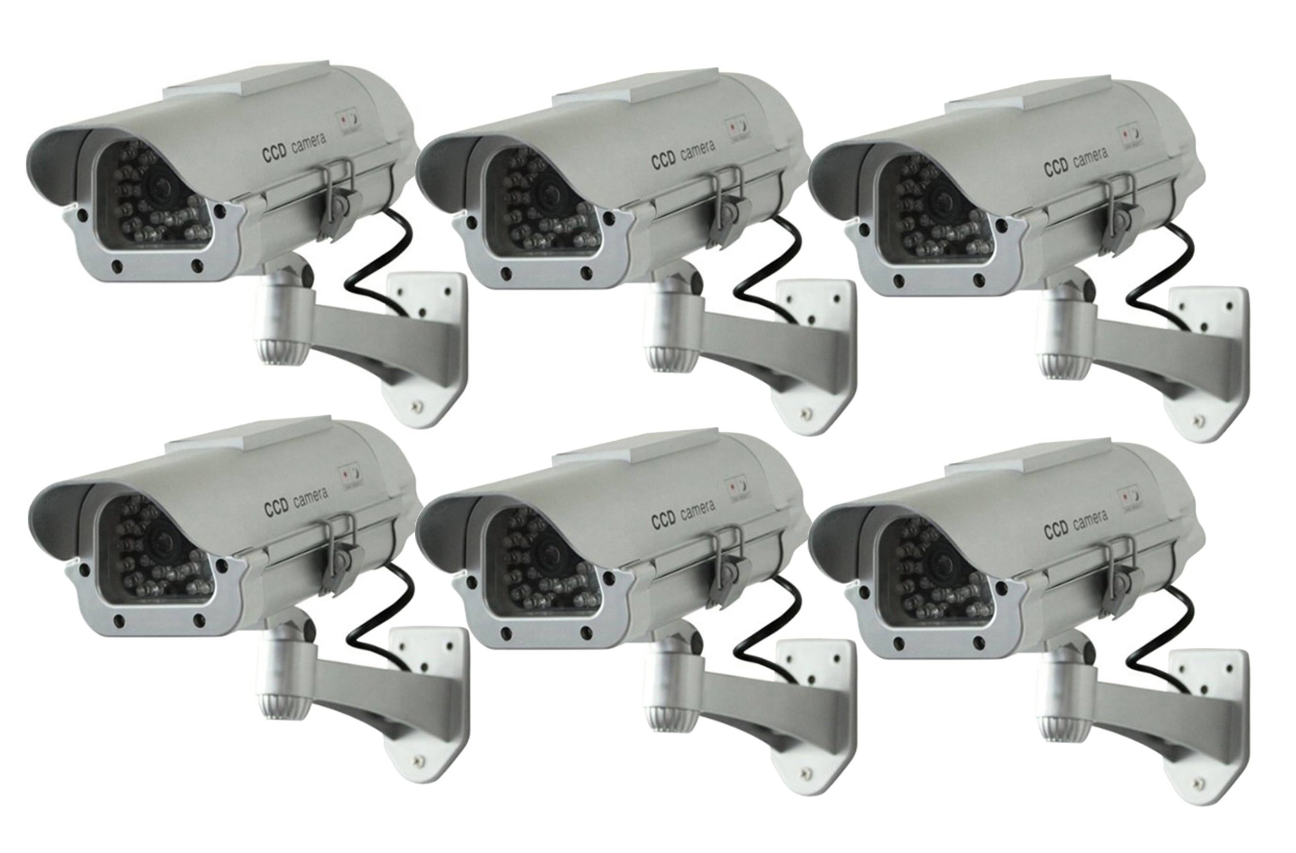 You receive six decoy cameras, each with mounting hardware, allowing for flexible placement around your property without additional purchases.