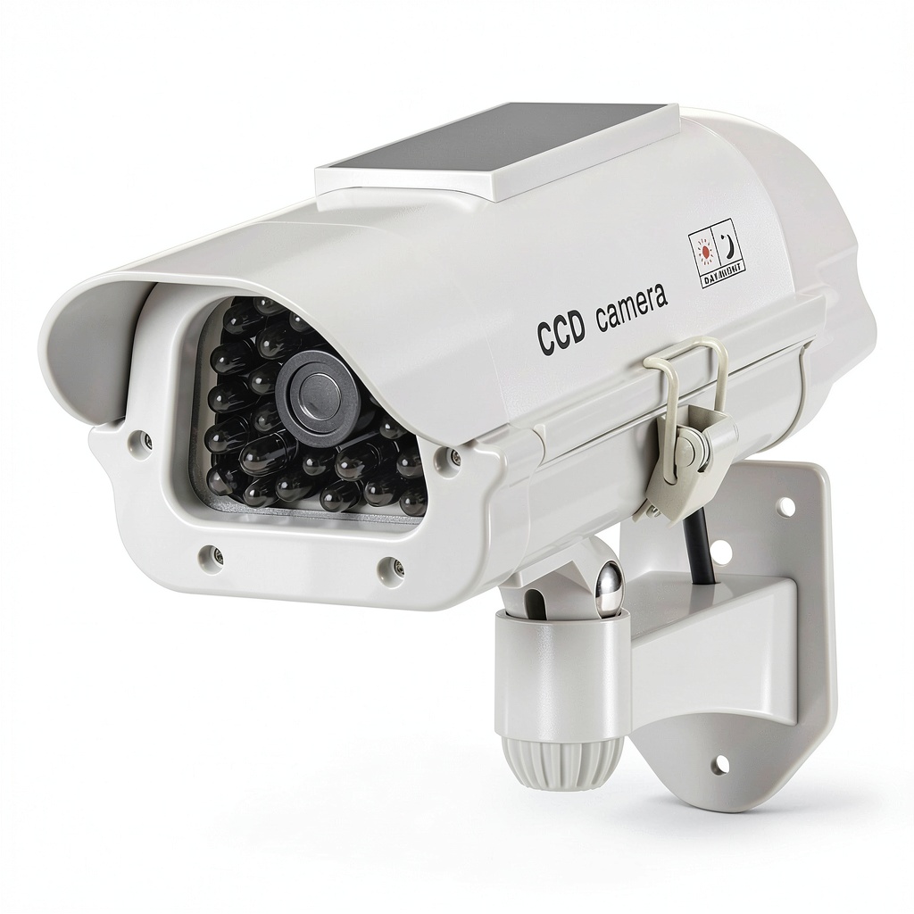 It features a highly realistic design with IR-style LEDs that glow to simulate active recording, along with a sunshield and authentic casing that closely resembles functional security cameras.